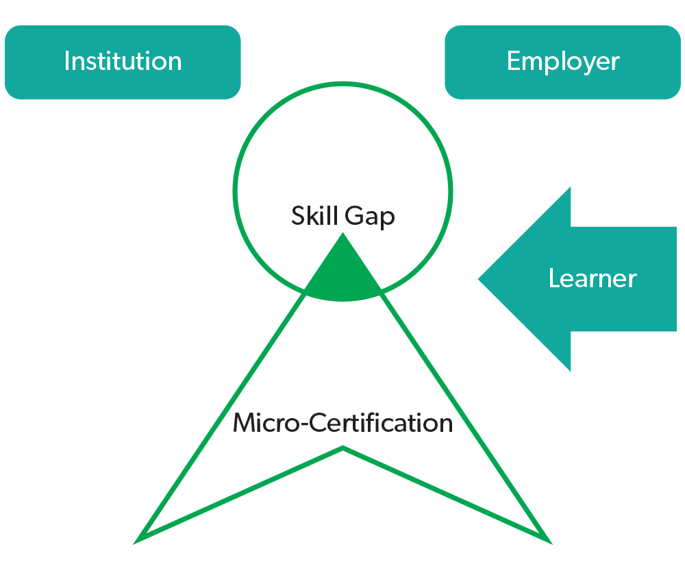Micro-credentials could capture the informal learning that takes place in the workplace or it could meet a specific need in the workplace. The main application of micro-credentials to the world of work is to fill a skills gap that is needed in a particular industry. The employer ideally works with a post secondary institution to meet the needs if the industry. This is shown in graphical form below: