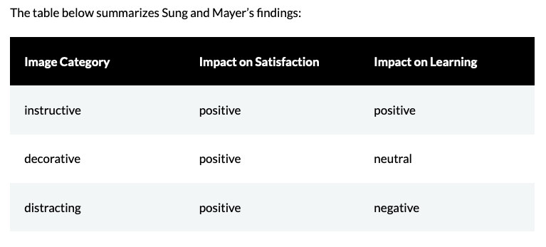 As cited in the MIT article, Sung and Mayer (2012) explored the idea that any graphic in a learning experience can fall into one of three categories: instructive, decorative, or distracting.