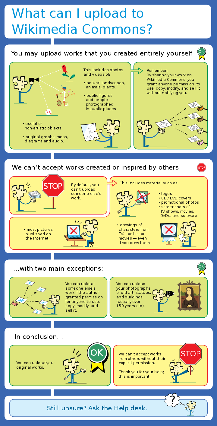 Note: You may find it handy to bookmark the location of Commons:Contributing your own work AND to keep a copy of the infographic: What can I upload to Wikimedia Commons?